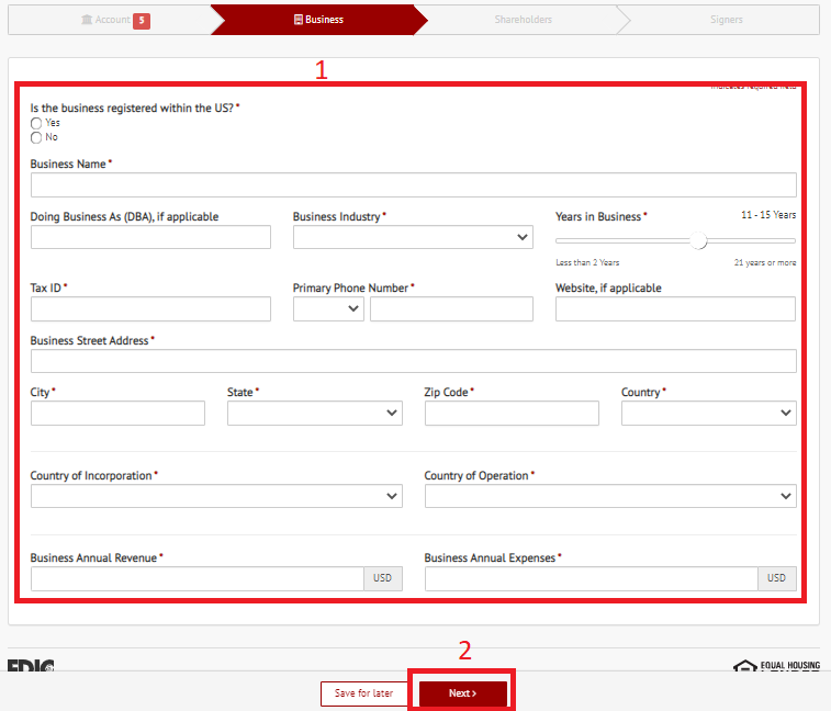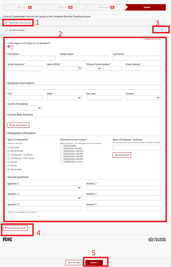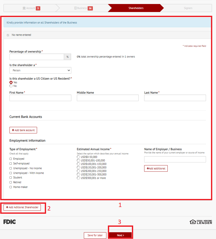 1. Enter information of all persons or entities that are shareholders. Ensure that the total ownership percentage equals 100%